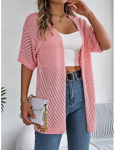 女性用 カーディガン ケーブルニットセーター ストリートファッション 日常 スタイリッシュ ピュアカラー ケーブル かぎ針編み オープンフロント メッシュ ニット ドロップショルダー 半袖 ロングトップス ニット 家 パーティー 日常 ホワイト ピンク 夏 春