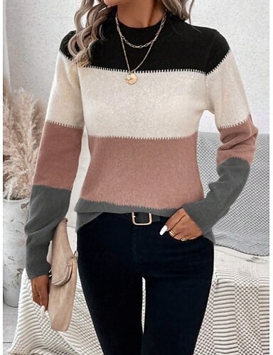 女性用 ニット カジュアル ソフト ストライプ リブ クルーネック パッチワーク ニット 長袖 レギュラートップス ニット アウトドア 日常 週末 ピンク キャメル 秋 冬