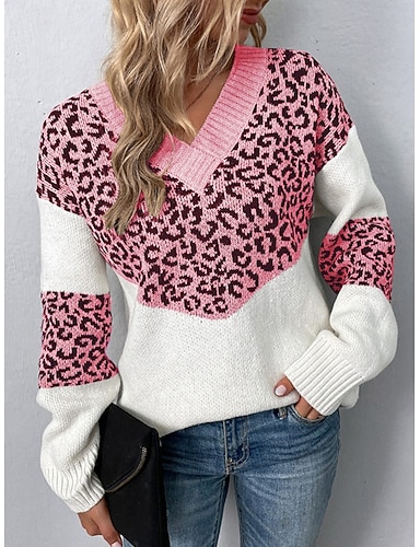 女性用 ニット カジュアル ソフト レオパード リブ Vネック ニット 長袖 レギュラートップス ニット アウトドア 日常 週末 ピンク ブルー 秋 冬