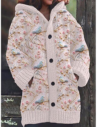 女性用 カーディガン 旅行度假风 日常 フラワー リブ フード付き ニット プリント フロントポケット 長袖 レギュラートップス ニット アウトドア 日常 祝日 ホワイト イエロー 秋 冬