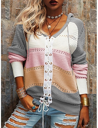 女性用 ニット カジュアルセーター カジュアル ソフト カラーブロック クルーネック レースアップ フード付き 長袖 レギュラートップス ニット アウトドア 日常 週末 ブラック ピンク 秋 冬