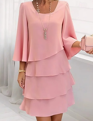 女性用 ミニドレス シフォンドレス ティアードワンピース ファッション 近代の アウトドア バケーション お出かけ レギュラー 平織り 七分袖 クルーネック ピンク ルビーレッド ネイビーブルー カーキ色 春 秋