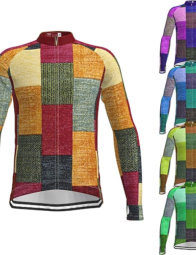 男性用 サイクリングジャージー グラフィック カラーブロック チェック 格子柄 長袖 バイク ジャージー トップス 3つのリアポケット付き マウンテンサイクリング ロードバイク 速乾性 反射性ストリップ 後ポケット 吸汗性 スポーツ イエロー ブルー パープル 衣類
