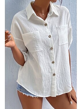 女性用 コットンリネンシャツ ボタンアップ ブラウス 平織り ベーシック 近代の 半袖 Vネック ロングトップス 日常 お出かけ ブラック ホワイト アーミーグリーン 夏