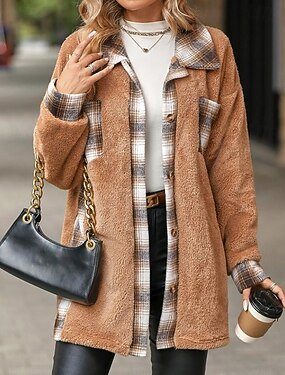 女性用 シャツジャケット 快適 パッチワーク 活発的 ファッション カジュアル 格子 学校 アウトドア バケーション 家 ボタン付きフロント レギュラー 折襟 ルーズフィット 長袖 アウターウェア 格子 春 秋