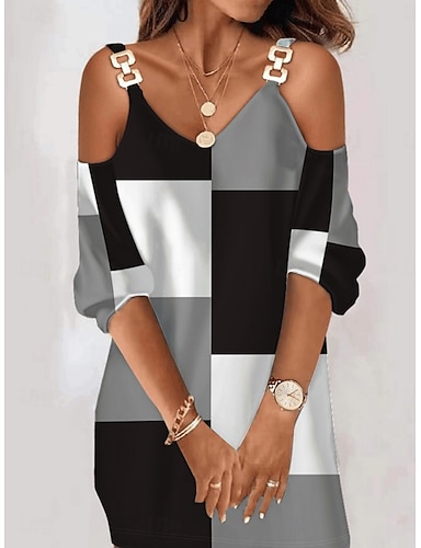女性用 ミニドレス カジュアルドレス 冬のドレス シフトドレス ファッション 近代の 日常 ビーチ 週末 レギュラー チェック 長袖 Vネック グレー 夏 春 秋