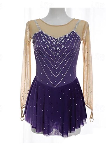 フィギュアスケート ドレス 女性用 女の子 アイススケート ドレス バイオレット パッチワーク 指穴付き メッシュ スパンデックス 伸縮性あり 訓練 レッスン用 プロフェッショナル スケートウェア 保温 クリスタル・ラインストーン 長袖 アイススケート フィギュアスケート