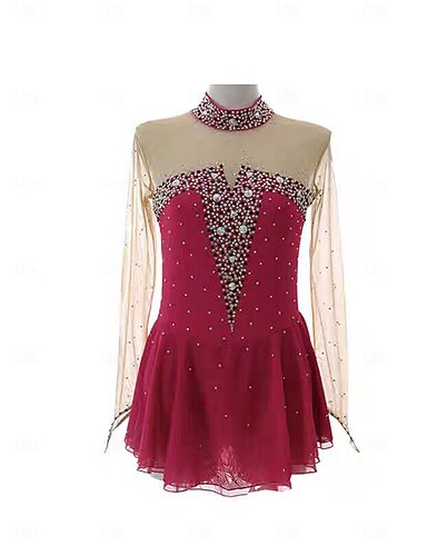 フィギュアスケート ドレス 女性用 女の子 アイススケート ドレス バーガンディー 指穴付き メッシュ スパンデックス 伸縮性あり 訓練 レッスン用 プロフェッショナル スケートウェア 保温 クラシック クリスタル・ラインストーン 長袖 アイススケート フィギュアスケート