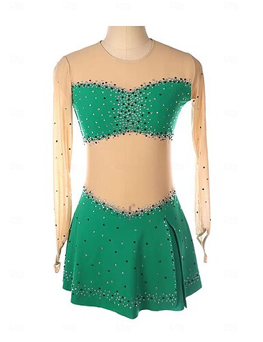 フィギュアスケート ドレス 女性用 女の子 アイススケート ドレス グリーン パッチワーク 指穴付き メッシュ スパンデックス 伸縮性あり 訓練 レッスン用 プロフェッショナル スケートウェア 保温 クリスタル・ラインストーン 長袖 アイススケート フィギュアスケート