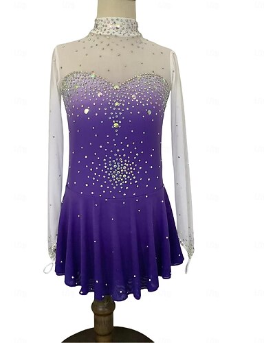 フィギュアスケート ドレス 女性用 女の子 アイススケート ドレス パープル 指穴付き ハロ染色 メッシュ スパンデックス 伸縮性あり 訓練 レッスン用 プロフェッショナル スケートウェア 保温 クラシック クリスタル・ラインストーン 長袖 アイススケート フィギュアスケート