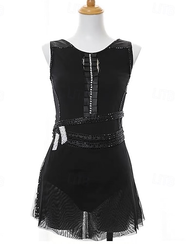 フィギュアスケート ドレス 女性用 女の子 アイススケート ドレス ブラック パッチワーク オープンバック メッシュ スパンデックス 伸縮性あり 訓練 レッスン用 プロフェッショナル スケートウェア 保温 クリスタル・ラインストーン ノースリーブ アイススケート フィギュアスケート