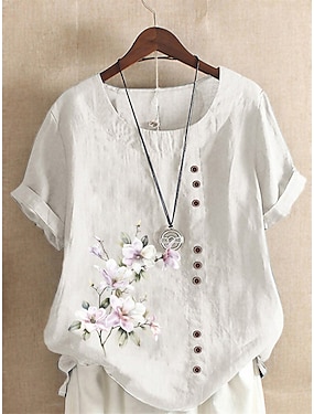 女性用リネンシャツ Tシャツ フローラル ストリートウェア ショートスリーブ クルーネック レギュラートップス リネン バケーション デイリー 外出用 ボタン プリント ネイビーブルー ブルー アーミーグリーン ライトブルー コーヒー サマー スプリング