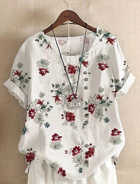 女性用 シャツ ブラウス コットンリネンシャツ フラワー カジュアル 半袖 クルーネック レギュラートップス バケーション 日常 ボタン プリント ホワイト 夏