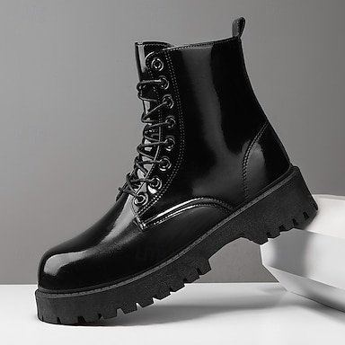 チャンキーソールを備えた黒の高光沢レザーのメンズレースアップブーツ。バイク乗り、ロック愛好家、カジュアルなストリートスタイル、トレンディなファッションに欠かせないアイテムです。
