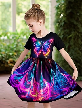 女子 3D バタフライ ドレス 半袖 3Dプリント 夏 日常 祝日 カジュアル 美しい 子供 3〜12年 カジュアルドレス スケーターワンピース 膝上 レギュラー