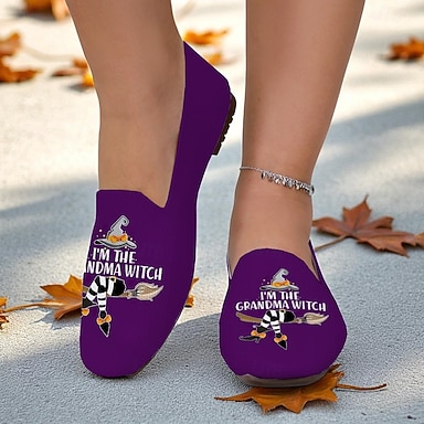 「私は魔女おばあちゃん」プリントのレディースフライニットスリッポンシューズ。秋のお祭りや普段使いにぴったりの軽量ハロウィンカジュアルシューズ。