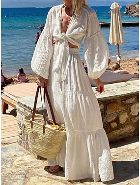 女性用 ドレスセット 白いドレス スイングドレス ボヘミアン 平織り レースアップ ラッフル ロングドレス マキシドレス 長袖 Vネック バケーション ビーチ ホワイト 夏 春 レギュラー