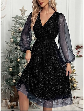 レディース ホリデードレス 長袖 幾何学模様 グリッター柄 フェイクファートリム エレガント 冬 パーティー ブラック レギュラーフィット 各種サイズ