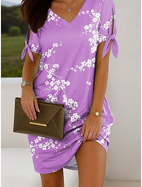 女性用 ミニドレス T シャツドレス サンドレス A ラインドレス 旅行度假风 カジュアル ビーチスタイル お出かけ ビーチ フラワー グラフィック 半袖 Vネック ライトグリーン ライトブラウン パープル ライラック 夏