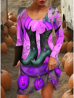 ハロウィン レディース ウィッチ プリント ミニドレス クルーネック ロングスリーブ Tシャツ ドレス ティードレス Aライン ドレス カジュアル デイリー 外出用 レギュラーフィット グラフィック パンプキン ブルー パープル オレンジ グリーン 秋 冬