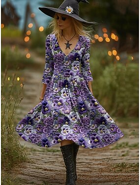 Halloween 女性用 ミディドレス A ラインドレス 旅行度假风 カジュアル 結婚式 パーティー 誕生日 レギュラー フラワー グラフィック ローズ 七分袖 Vネック イエロー ラスティ・レッド パープル 春 秋