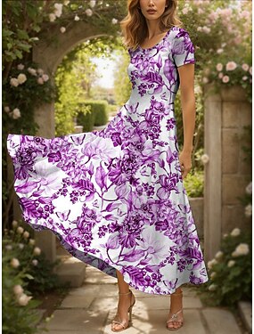 ウィメンズマキシドレスカジュアルドレスサンドレスシフトドレススタイリッシュカジュアルドロップショルダーバケーションデイリーレギュラーフィットフローラルショートスリーブVネック紫緑春秋
