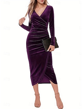 女性用 ミディドレス ベルベットドレス 二次会ドレス / カクテルドレス エレガント スタイリッシュ セクシー パーティー レギュラー 平織り 長袖 Vネック ブラック ワイン ロイヤルブルー ダークグリーン 春 秋