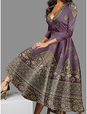 女性用 ミディドレス ヴィンテージドレス カジュアルドレス 冬のドレス スイングドレス ヴィンテージ エスニック トライバル風 フォーマル バケーション パーティー レギュラー トライバル 七分袖 Vネック ブルー パープル グリーン 秋 冬
