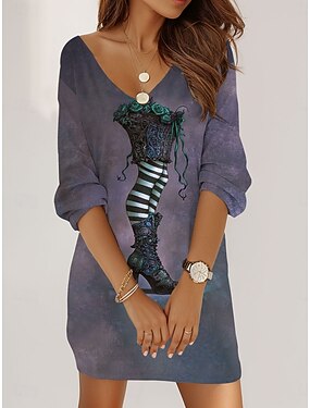 ハロウィン レディース ウィッチ プリント ミニドレス シフトドレス バケーション カジュアル デイリー ホリデー カクテルパーティー レギュラーフィット グラフィック アブストラクト ロングスリーブ Vネック パープル グリーン グレー サマー 春 秋 秋