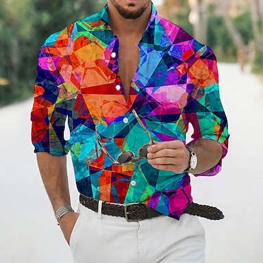 男性用 幾何学模様 シャツ ボタンアップシャツ 長袖 ファッション デザイナー カジュアル アウトドア 祝日 夏 春 折襟 プリント ボタンダウン ホワイト ブルー グリーン レインボー