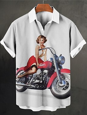 男性用 ビンテージ オートバイ ピンナップガール シャツ アロハシャツ 半袖 シャツ 折襟 ヴィンテージ ファッション ストリートファッション アウトドア ストリート カジュアル ホワイト ルビーレッド ベージュ S M L
