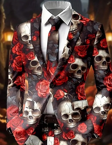 男性用 スカル ローズ ブレザージャケット コート 快適 高通気性 アーティスティック ゴシック カジュアル パーティー 日常 祭り 3Dプリント ボタン マルチポケット 秋 冬 秋冬 折襟 長袖 黒1 ブラック ルビーレッド