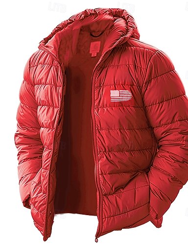 男性用 アメリカの米国旗 冬物コート ダウン パフジャケット 保温 防雨 ライトウェイト カジュアル アウトドア 日常 パッド入りキルティングフードジャケット 秋 冬 フード付き 長袖 ルビーレッド ロイヤルブルー アーミーグリーン