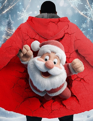 クリスマス 男性用 サンタクロース 冬物コート フリースの上着 コート 保温 快適 カジュアル デイリーウェア ジッパー ポケット 3Dプリント 秋 冬 フード付き 長袖 ホワイト ルビーレッド ブルー