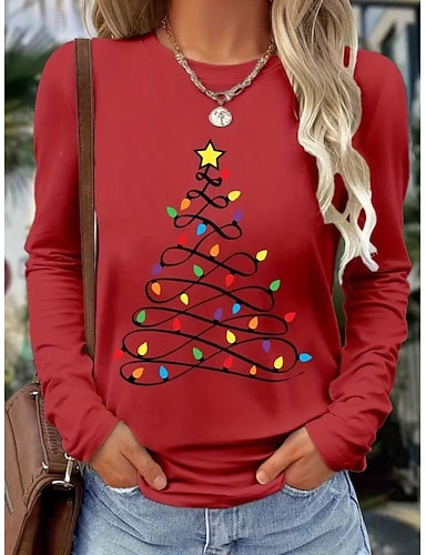 クリスマス レディース Tシャツ グラフィック ビンテージ ファッション スタイリッシュ 長袖 クルーネック ラウンドネック レギュラー トップス デイリー 週末 プリント ホワイト レッド 秋 冬