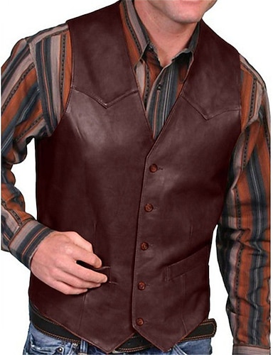 男性用 レザーベスト デイリーウェア バケーション お出かけ ヴィンテージ ファッション 春 & 秋 ボタン 合皮 快適 平織り シングルブレスト Vネック レギュラー レッド ブラウン ベスト