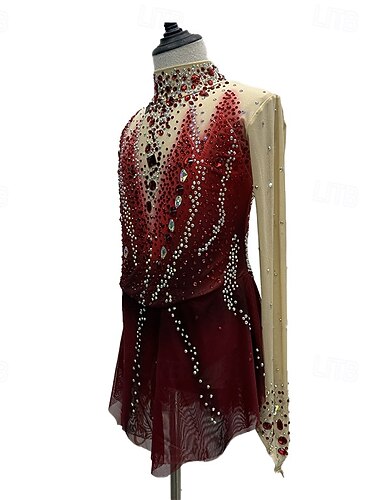 フィギュアスケート ドレス 女性用 女の子 アイススケート ドレス レッド パッチワーク ハロ染色 メッシュ スパンデックス 高弾性 訓練 レッスン用 プロフェッショナル スケートウェア クラシック クリスタル・ラインストーン 長袖 アイススケート フィギュアスケート