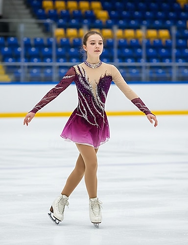 フィギュアスケート ドレス 女性用 女の子 アイススケート ドレス パープル パッチワーク オープンバック メッシュ 高弾性 訓練 競技大会 スケートウェア クラシック クリスタル・ラインストーン 長袖 アイススケート フィギュアスケート