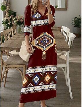 ウィメンズマキシドレス カジュアルドレス Tシャツドレス ティードレス フローラルトライバル ポケットプリント Vネック ロングドレス マキシドレス ヴィンテージ エスニック デート バケーション ロングスリーブ 秋 冬