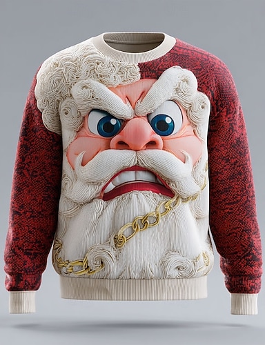 醜いクリスマスセーター 男性用 サンタクロース プルオーバーセーター ニット クルーネック カジュアル バケーション 日常 3Dプリント 保温 長袖 春 秋 冬 ルビーレッド