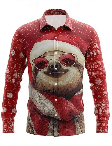 クリスマス 男性用 動物 ナマケモノ クリスマス帽子 シャツ ボタンアップシャツ 長袖 おかしい アウトドア 祝日 春 秋 折襟 3Dプリント 襟付きシャツ ホワイト ルビーレッド