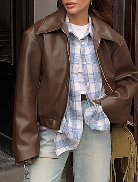 女性用 レザージャケット 保温 快適 ジッパー ポケット ヴィンテージ カジュアル 純色 バケーション ストリート カジュアル デイリーウェア ショート レギュラー 折襟 レギュラー 長袖 アウターウェア ブラック ワイン 秋 冬