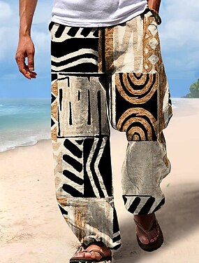 男性用 パンツ ミディアムウエスト 巾着ゴムウエスト ハワイアン 祝日 ビーチ ストレートレッグパンツ 夏 春 秋 3Dプリント ベージュ