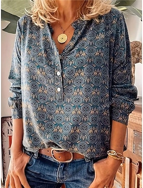 女性用 ブラウス グラフィック 星形 エレガント ヴィンテージ ファッション 長袖 クルーネック ラウンドネック レギュラートップス 日常 お出かけ 週末 ホワイト ブルー ダークブルー 秋