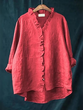 レディース コットンリネン ブラウス 無地 エレガント カジュアル 長袖 Vネック レギュラートップス デイリー ホリデー ボタン ホワイト イエロー レッド ブルー ベージュ 夏 秋