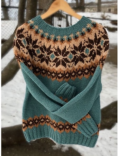 女性用 ニット フェアアイルセーター プルオーバー ストリートファッション カジュアル 幾何学模様 リブ クルーネック ニット 長袖 レギュラートップス ニット アウトドア 日常 週末 グリーン 秋 冬