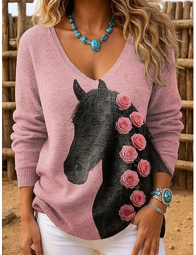 女性用 ニット プルオーバー ファッション ストリートファッション カジュアル グラフィック 動物 Vネック 特大の ニット 長袖 レギュラートップス ニット アウトドア 日常 ピンク 春 秋
