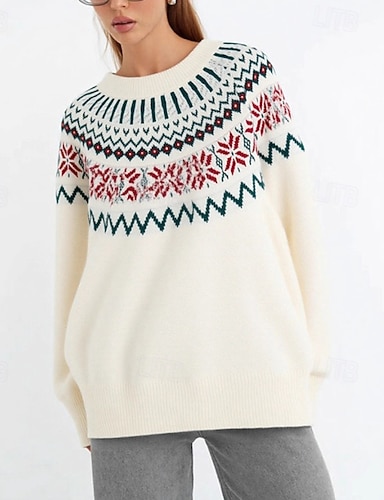 女性用 ニット フェアアイルセーター ファッション ストリートファッション カジュアル 雪片 リブ クルーネック ニット 長袖 レギュラートップス ニット アウトドア 日常 週末 ホワイト 秋 冬