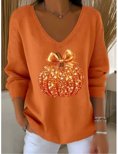 ハロウィン レディース セーター カジュアル ソフト リブ Vネック ニット 長袖 レギュラー トップス ニット アウトドア デイリー ブラック オレンジ 秋 冬
