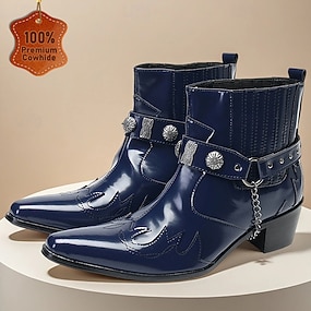 シルバーチェーンストラップとエンボス加工のディテールが施されたメンズネイビーパテントレザーアンクルブーツ。コンサートやファッションイベントに最適な100%牛革ウエスタンブーツ。